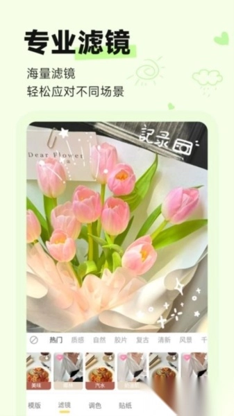 3、素材丰富:拥有海量滤镜、贴纸与字体库,并且会定期更新,让你的创意不受限制,每次使用都能有新的发现。