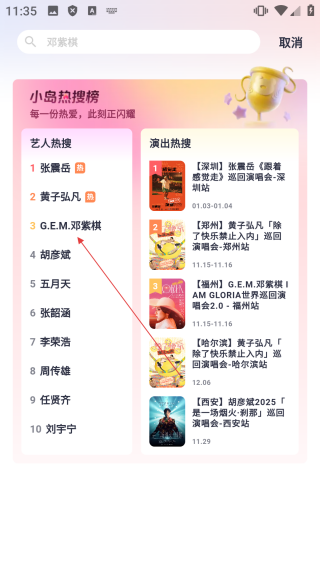 2、当进入搜索界面后,于艺人热搜榜里,通过搜索或者点击【目标艺人】,从而进入该艺人的详情界面。