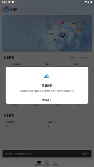1、进入界面后,可直接使用巨量营销、巨量千川、产品智推以及巨量学等功能。