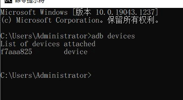 5、在相应操作界面输入“adb devices”指令,以此确认手机与电脑连接状态正常。