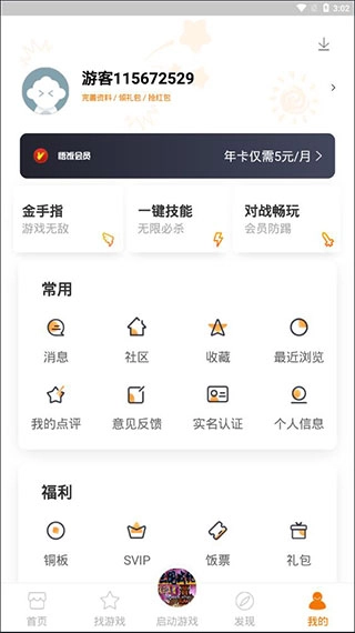 7、点击下方菜单栏的“我的”,即可查看关于玩家账号的一些信息,包括软件的设置也都在这,玩家可以进行金手指和一键技能的设定,也可以查看收藏和浏览记录。