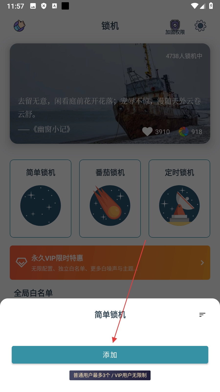 2、在操作选项里,点击【添加】按钮,即可进入锁机时长的设置界面。
