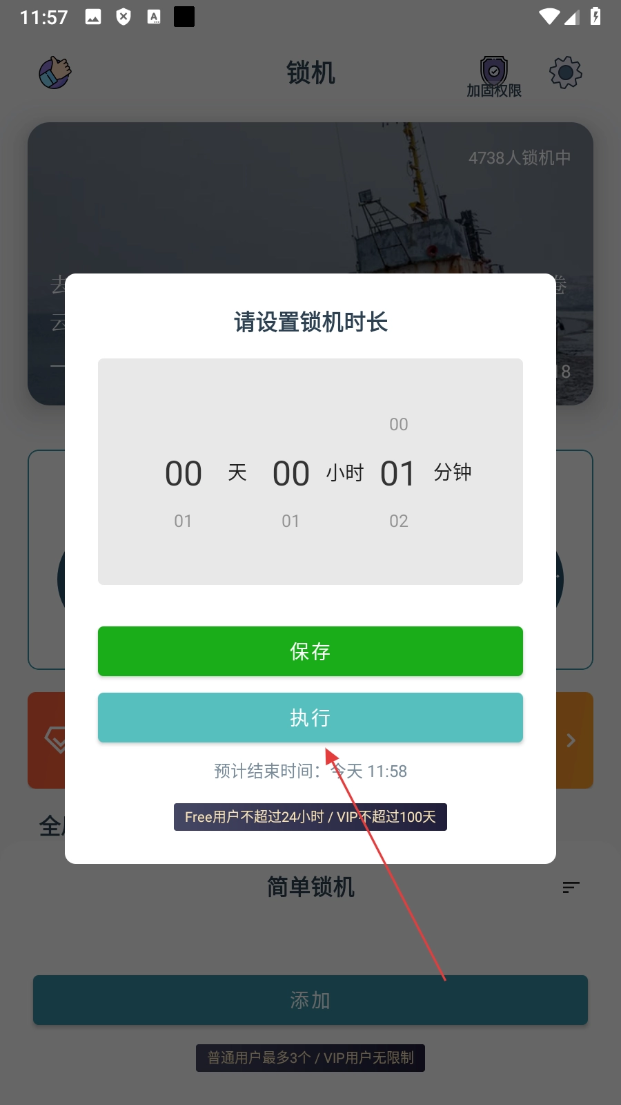 3、在设置页面完成锁机时长的设置后,点击【执行】按钮,即可启动锁机操作。