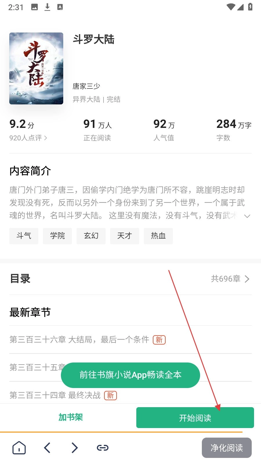 4、点击小说进入详情页面后,接着点击【开始阅读】按钮,就能开启小说阅读了。