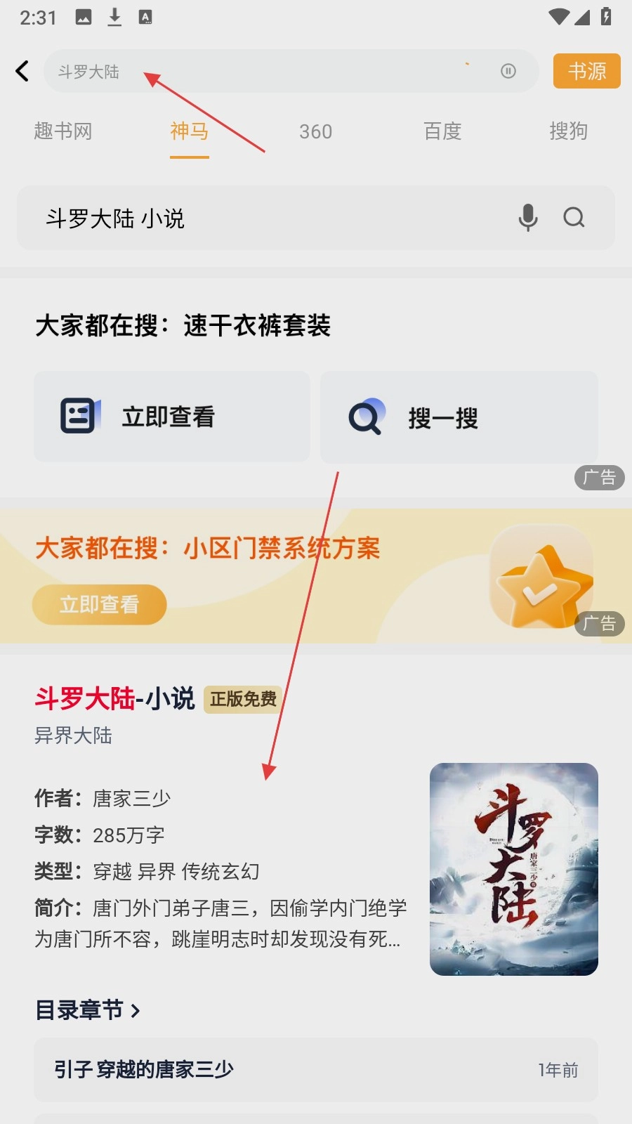3、输入完成后,在搜索结果中【找到对应的小说】。