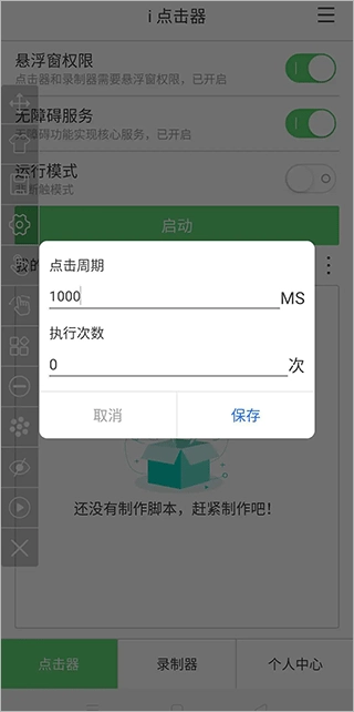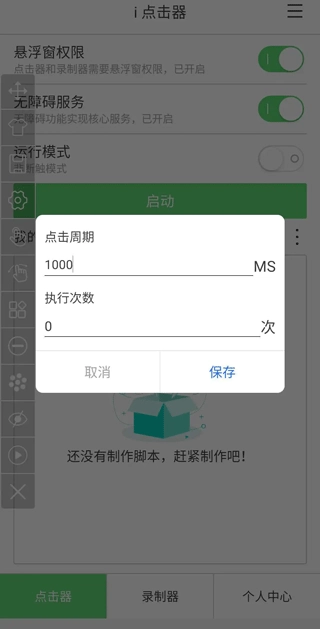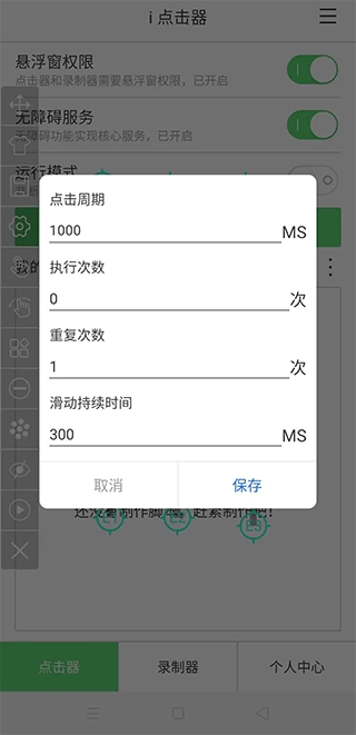 1、设置支持:可对周期、执行次数、重复次数、触摸时长、滑动持续时间、点击位置偏移距离、触摸时长随机时间以及条件智能识图进行设置操作。