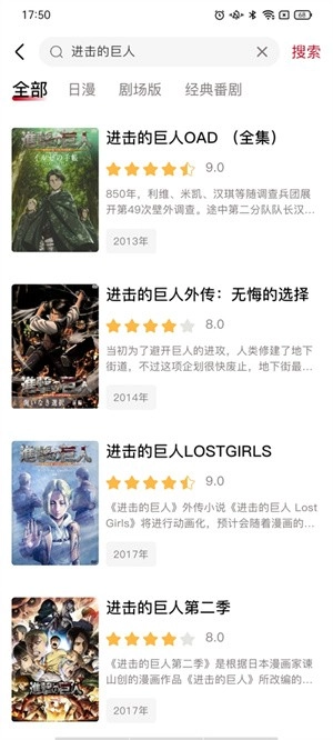 点击搜索框就能直接查找对应的动漫作品,例如《进击的巨人》。