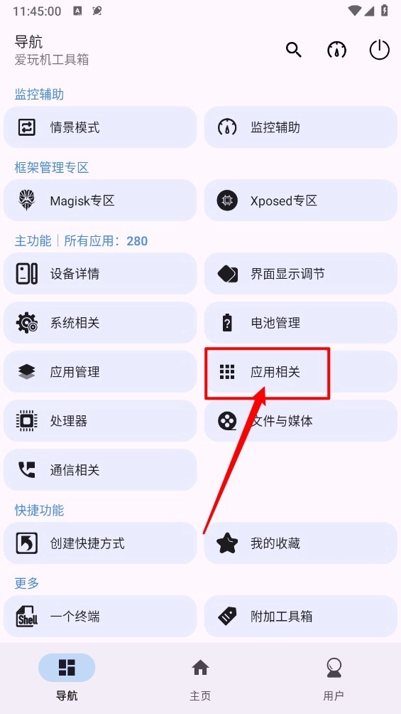 1、启动爱玩机工具箱,进入导航板块,点击“应用相关”。