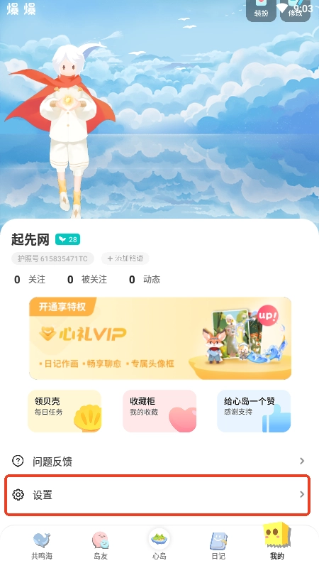 1、打开心岛日记应用,点击底部的【我的】选项,接着点击【设置】按钮