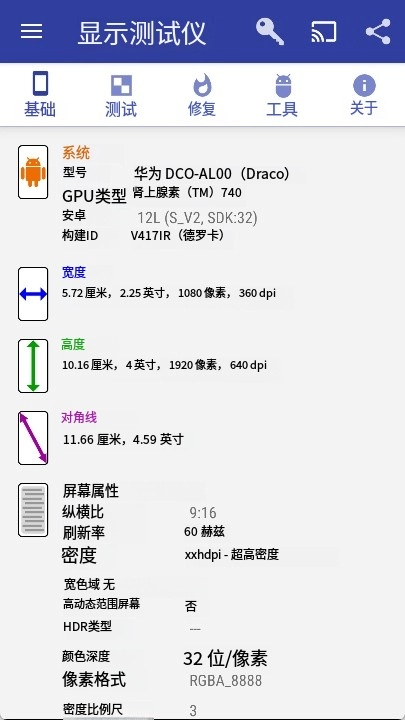 - 显示相关测量信息:可呈现屏幕尺寸、GPU类型、DPI等具体数据。