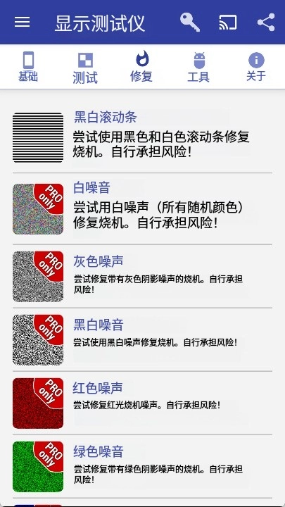 Display Tester是一款专注于手机屏幕检测的软件,既能对手机屏幕进行全方位的检查,也能协助我们解决一些小问题!而且无论手机采用的是LED屏还是OLED屏,Display Tester软件都能便捷地识别出来!这款烧屏修复软件的操作方式相当智能,我们只需依据屏幕出现的具体状况选择对应的功能即可。比如开启坏点测试功能后,软件会展示一系列纯色背景页面,借此检测屏幕是否存在坏点,进而判断屏幕的完好程度。