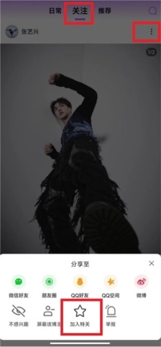 方法一:进入首页的“关注”标签页后,找到目标帖子,点击其右上角的“三个点”图标,接着选择“加入特关”选项即可。