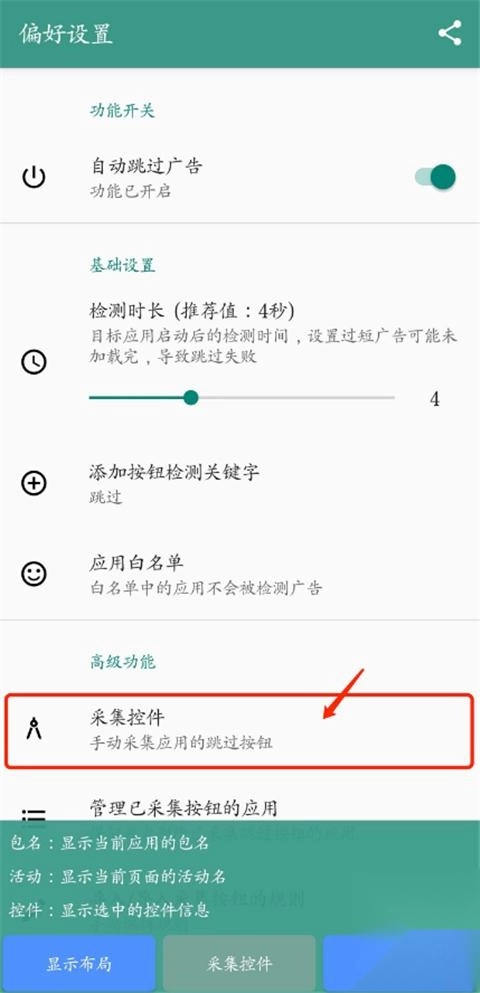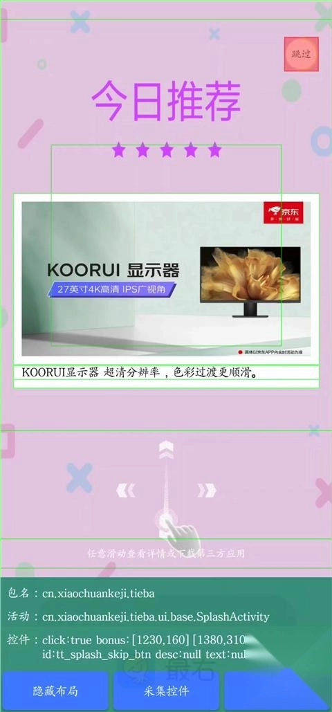 回到桌面,启动目标应用,这里以最右APP为例:进入应用后会弹出广告,这时先点击左下角的显示布局按钮,界面就会被绘制出布局框架,每个控件都会被绿色线条框住。