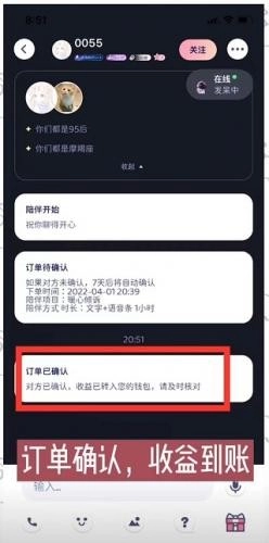 点击【完成陪伴】后,只需等待对方确认订单,你就能获取收益了。