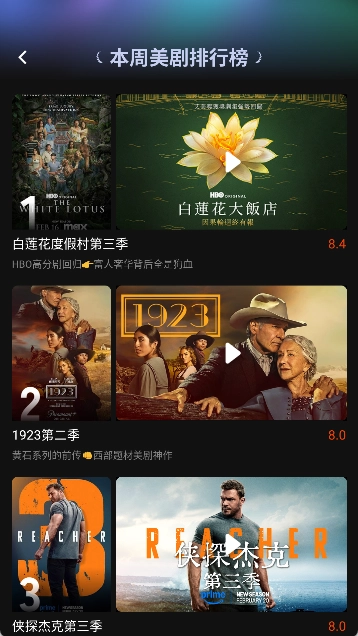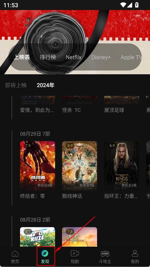 2. 发现页面上,能看到各种各样的排行榜单,既有每周更新的各类热门榜单,也有奈飞、迪士尼等国际主流平台的最新资讯。