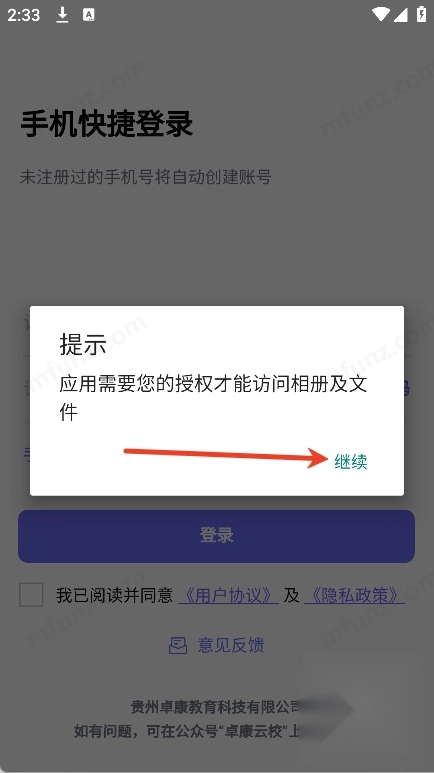 1、打开印中家校点击继续授予软件权限