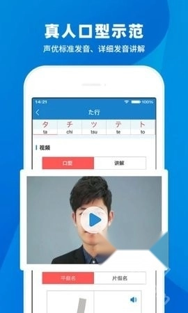 3、每一行假名学习页面,通过真人口型示范,发音音频,假名书写顺序全面学习发音、书写。