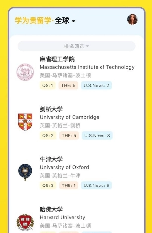 2、智能选校指导:为用户实时展示选校指标、分析学校特征、对比申请条件,助力用户找到最适合的留学机会。