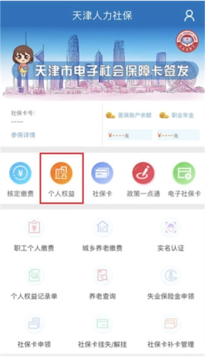 1、打开天津人力社保,登录账号后,点击个人权益。