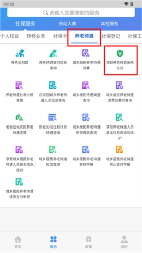 2、点击“更多服务,找到“养老待遇-领取养老待遇资格认证”;