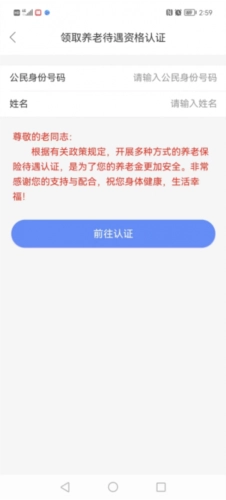3、点击“养老待遇领取资格认证”后界面如下。输入需要认证人员的身份证号码及姓名(可为其他人员认证),点击“前往认证”