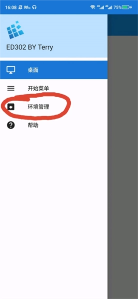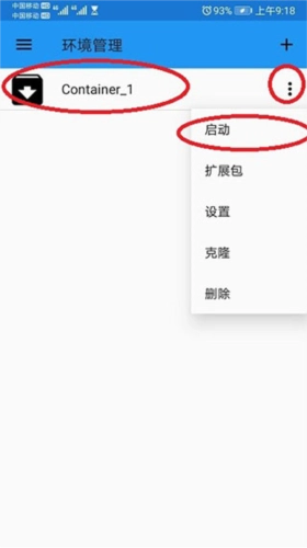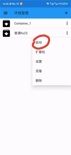 第三步、进入模拟器后,会出现一个空白的界面,你需要点击桌面左上角的三条杠,然后点击环境管理,在新的页面中点击三个竖着的点点,然后点击启动,就等待程序启动。