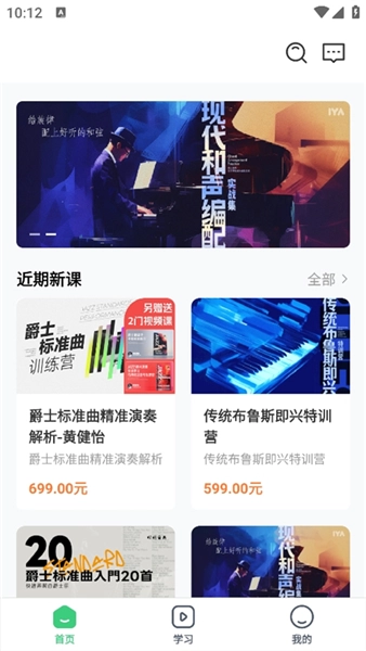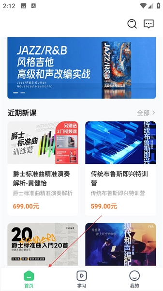 1、首页界面,有近期新课展示,如爵士标准曲精准演奏解析等课程,方便用户选择学习。