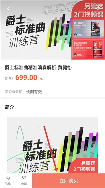 2、爵士标准曲精准演奏解析课程详情界面,用户可点击立即购买按钮购买课程,也可进行咨询和收藏。