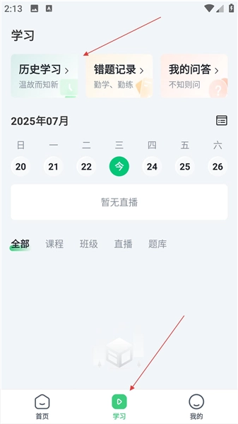 3、学习界面,有历史学习、错题记录等功能入口,还有2025年07月的日历展示,用户可查看当天及前后日期的学习安排。