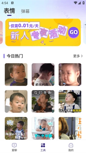 用户点击下方工具,就能添加表情包和弹幕,这里有丰富多样的表情包与弹幕可供选择,用户和他人聊天时可以快速发送,另外还有趣味表情套图可以使用。