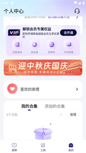 用户点击右下角的“我的”按钮,就能进入个人中心页面,在这里可以查看自己的账号信息,还能找到收藏过的聊天话术和表情包等内容。