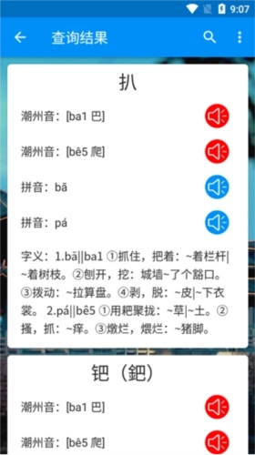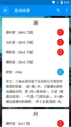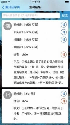 3、支持多字查询,可按照潮州话拼音、汉语拼音、汉字部首、汉字笔划数等条件进行查询,同时具备普通话与潮州话的发音功能。