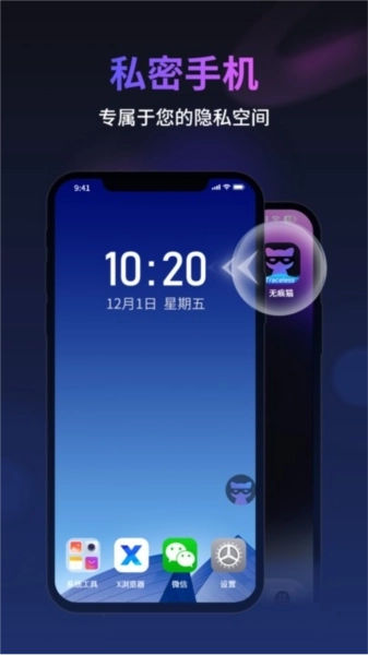 无痕猫是手机的绝密隐私空间,功能类似于手机分身,而且这个空间能够脱离真机独立运行。