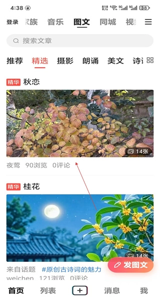 打开软件后,点击“精选分类”,便能看到秋恋、桂花等图文内容,同时还会展示对应的浏览量和评论数。