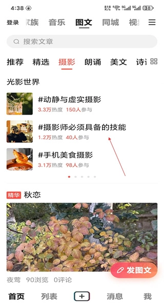 点击摄影分类后,可查看动静与虚实摄影、摄影师必备技能等热门话题,页面上还会显示各话题的参与人数和热度情况。